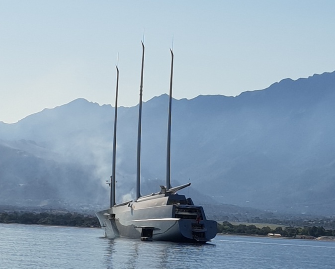 Le "Sailing Yacht", le plus grand yacht à voile du monde au large d'Osari en 2018 pourra s'amarrer dans le golfe de Saint-Florent grâce aux coffres d'amarrages. Crédits Photo : Amandine Morat