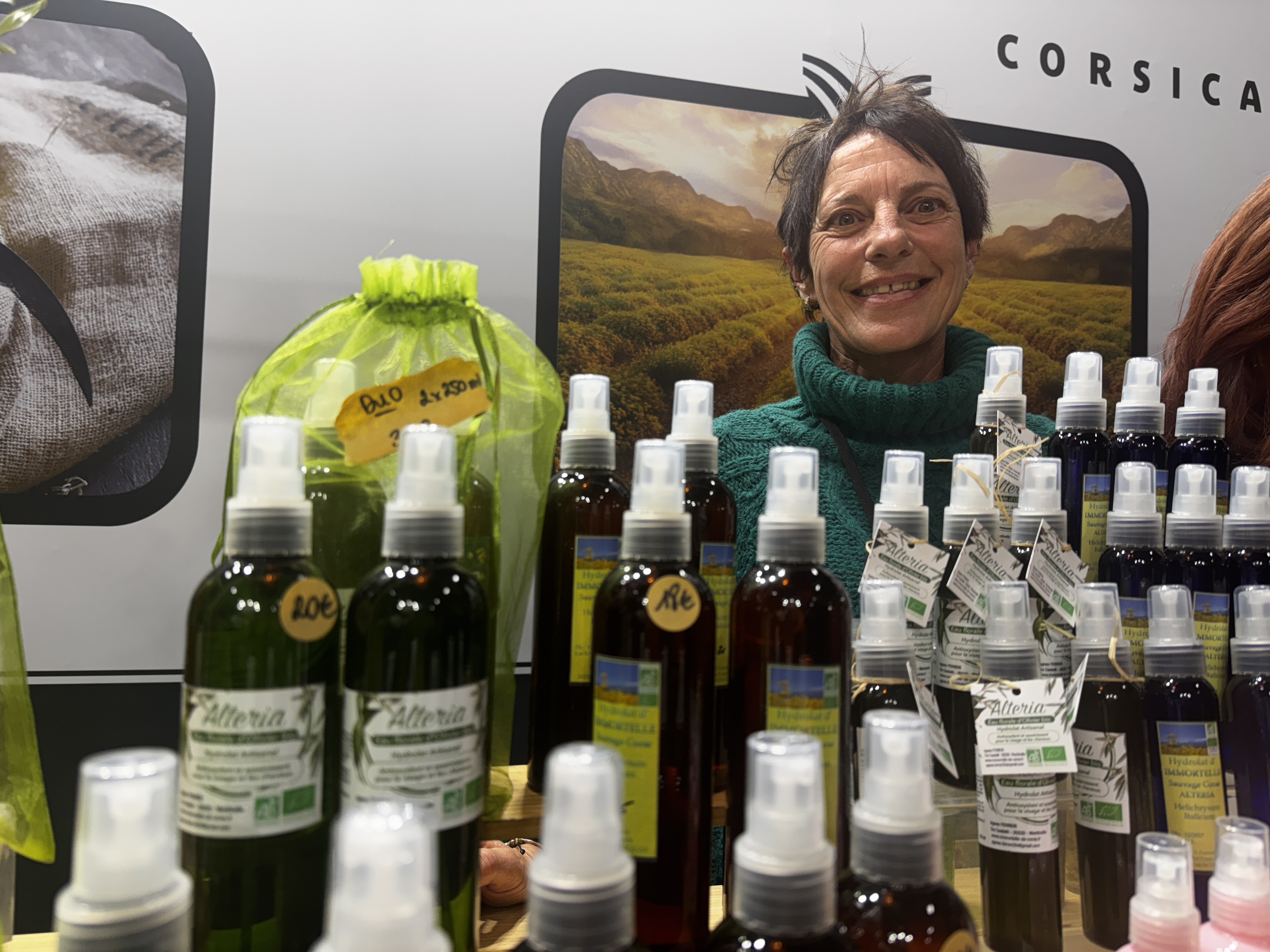 À quelques pas, Agnès Ferreri ne cache pas sa joie. La productrice de cosmétiques naturels basée à Monticellu expose pour la huitième année. Une façon pour elle d’avoir une vitrine sur le continent. « Je fais tester l’eau d’immortelle ou celle de fleur d’olivier, les gens achètent et ensuite ils commandent sur mon site Internet. Cela me rapporte chaque année environ 10 % de clientèle supplémentaire », assure-t-elle avant d’être interrompue par une cliente.