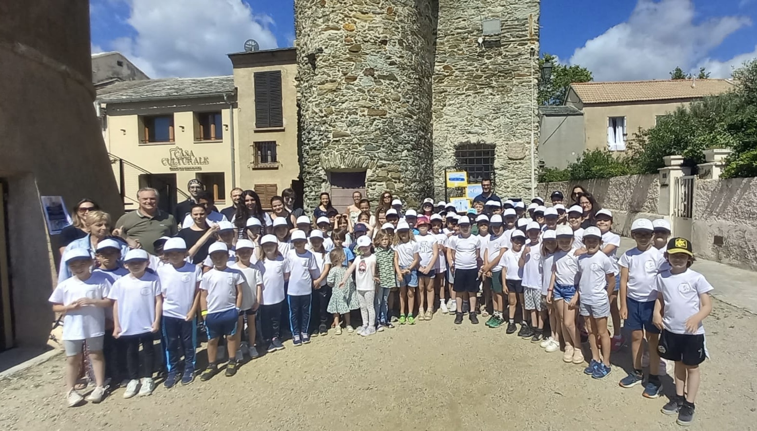Les enfants de l'école de Santa-Maria-di-Lota, réunis devant la Tour de Miomo pour inaugurer l'un des trois cendriers pédagogiques installés sur la commune, vendredi 24 mai 2024.