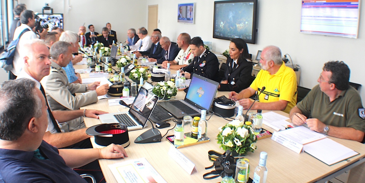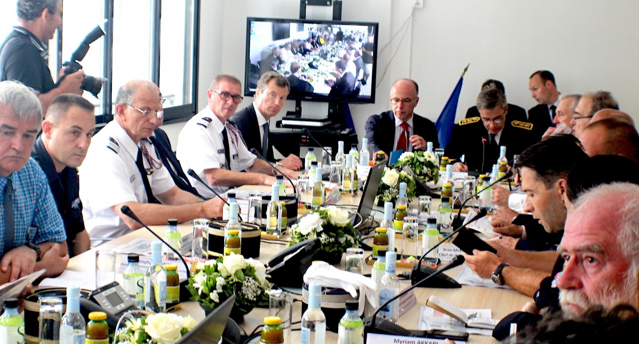 Enfin après avoir coupé le ruban traditionnel barrant l'entrée de l'Etat-major avec des ciseaux venus du ciel qui lui furent remis par les hommes du Grimp, Bernard Cazeneuve a présidé une double réunion en compagnie de tous les représentants des services impliqués dans la lutte contre l'incendie.