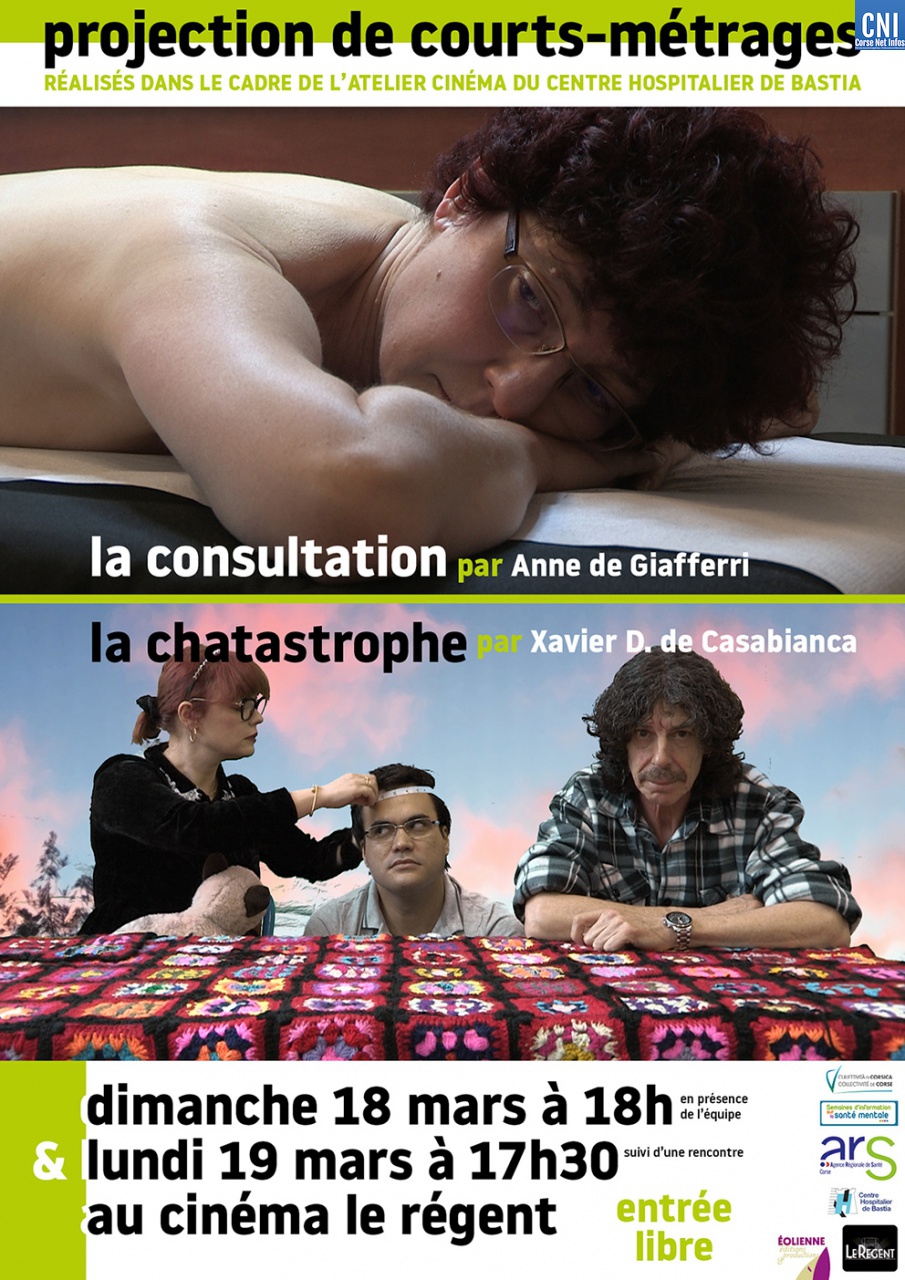 A 18 heures, Anne de Giafferri vient en effet présenter les deux courts-métrages qu’elle a réalisé avec l’équipe du service de psychiatrie de l’Hôpital de Bastia. Ce travail, initié depuis deux ans entre la réalisatrice, le personnel de service et les patients sous la houlette du Dr Graziani, est présenté dans le cadre de la SISM (Semaine d’Information sur la Santé Mentale). Ces semaines qui se déroulent chaque année sont un moment privilégié pour réaliser des actions de promotion de la santé mentale mais aussi pour construire des projets en partenariat et parler de la santé mentale avec l’ensemble de la population. C’est dans ce cadre qu’a été initié la projection de ces courts métrages mais surtout le travail en amont pour les réaliser avec des ateliers rassemblant les patients et les soignants. Anne de Giafferri que l’on connaît pour son travail documentaire – Théodore 1er Roi des Corses ou plus récemment La Règle du Je – a réalisé La Consultation et co-réalisé La Chatastrophe (voir plus bas). Elle a surtout encadré et dirigé les ateliers « cinéma » qui ont permis la réalisation de ces deux courts.
