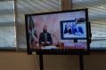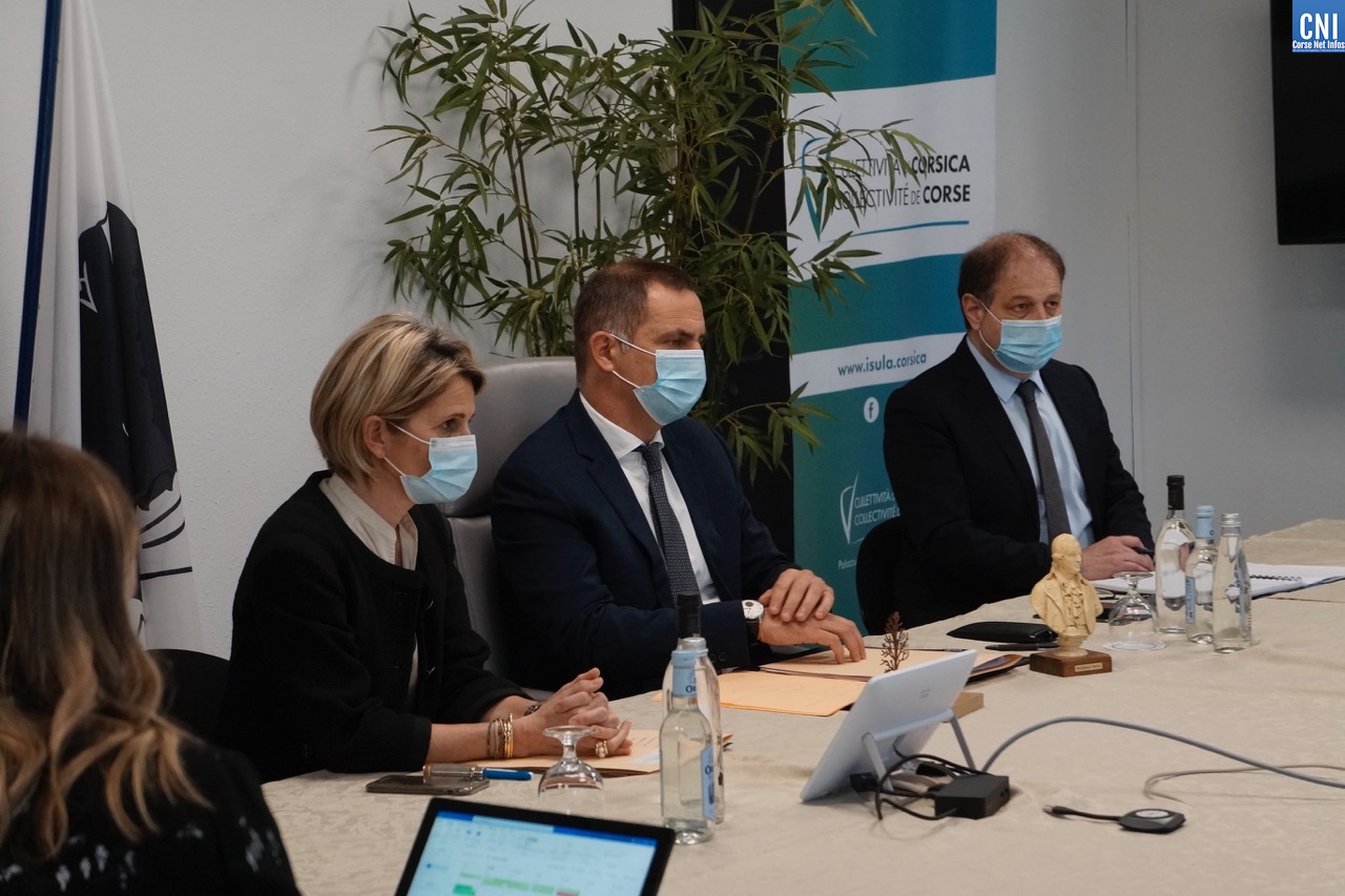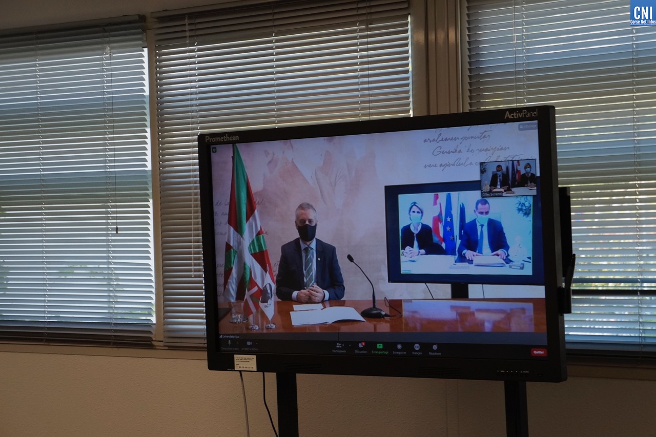 Nanette Maupertuis, Gilles Simeoni et Jean-Baptiste Calendini en visio conférence avec le Chef du Gouvernement Basque