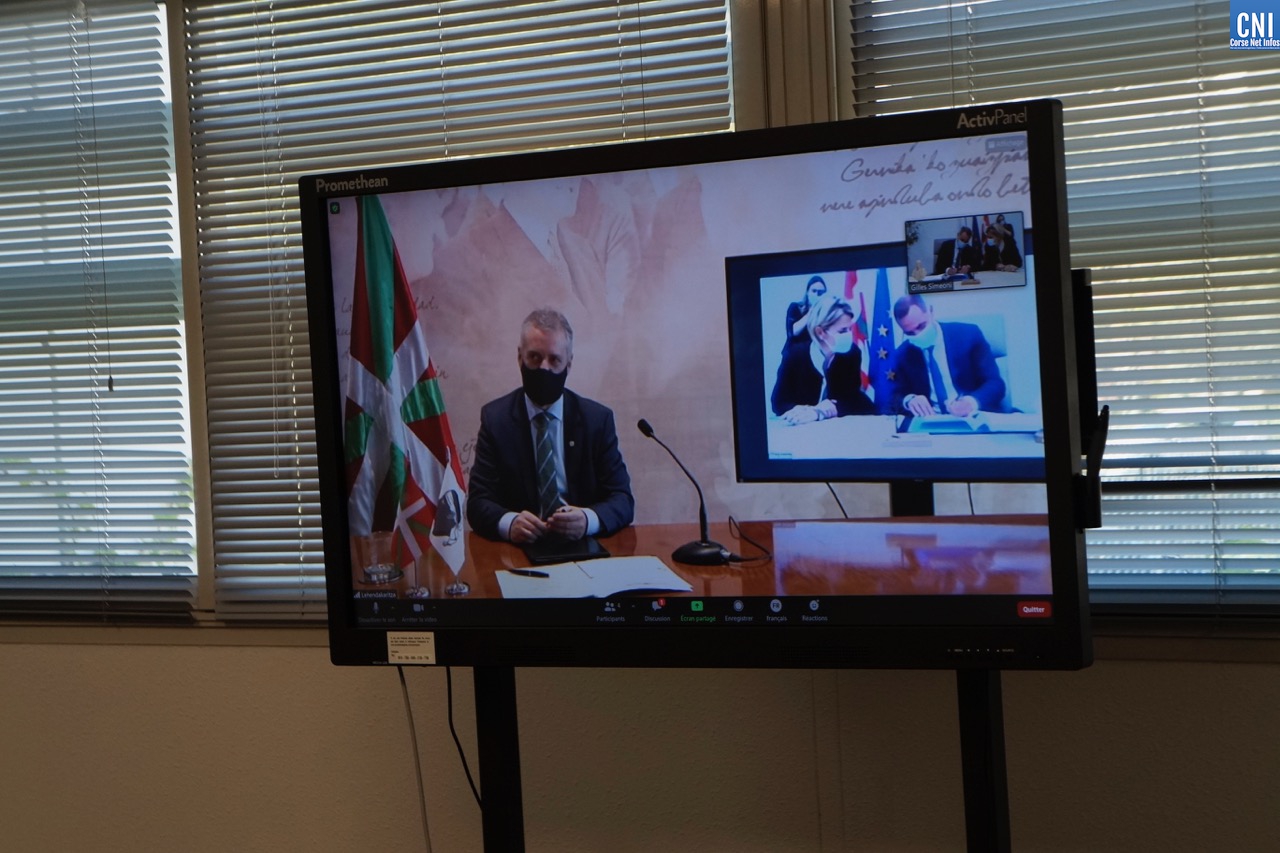 Le Chef de gouvernement de la Communauté Autonome du Pays Basque, Iñigo Urkullu, et le Président du Conseil exécutif de Corse, Gilles Simeoni, ont procédé ce mardi 13 avril, en visioconférence depuis l’Hôtel de la Collectivité de Corse de Bastia, à la signature officielle d’un mémorandum de coopération entre l’Euskadi et la Corse.