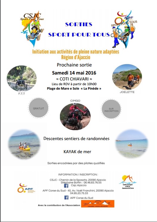 Samedi prochain, le 14 mai, la dernière sortie "Sport pour Tous" de la saison sera organisée par l'AFP e Corse-du-Sud et le CSJC d'Ajaccio. Le rendez-vous de tous les bénévoles sera à partir de 10h00 sous la Pinède de la plage de Mare e Sole à Coti, où sera installé le camp de base. Les rotations se feront à partir de ce lieu. Cette initiation aux activités de pleine nature est ouverte à tous.