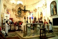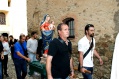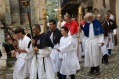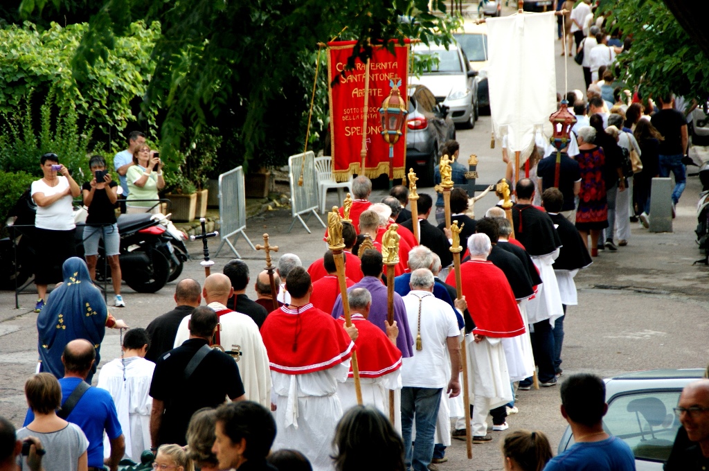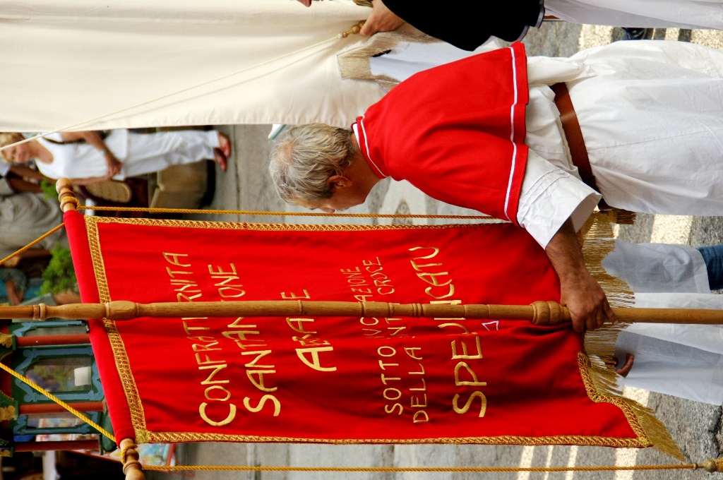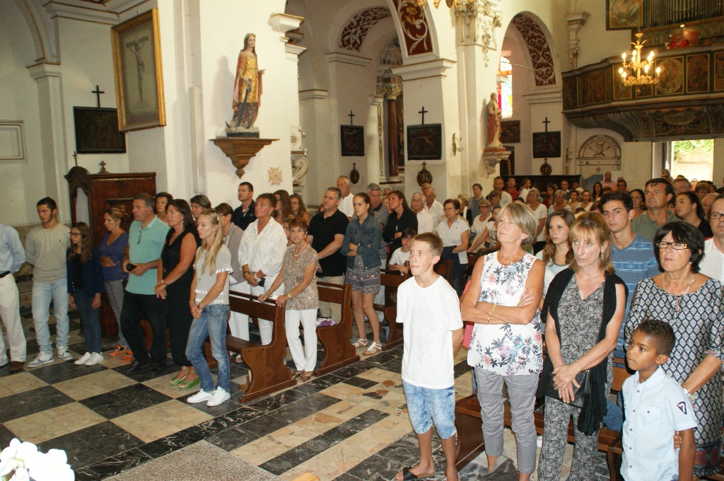 C’est donc en procession, sous les bannières flottant au vent, que les impétrants se sont rendus en l’église Santa-Maria Assunta qui avait de la peine à contenir les fidèles. Ceux-ci étaient venus forts nombreux afin de partager cet instant de communion et de prière sous la houlette du Père Piotr, curé de la paroisse. Avant que ne débute la liturgie, les 6 novices visiblement émus se sont tenus devant l’autel afin d’y recevoir comme le veut la tradition, leur mantilette (Capes) noires pour Santa Croce et rouges pour Sant’Antone Abbate.