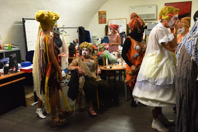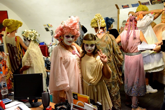 Entre masques et peplum, sacs Vuitton et chaussures Sergio Rossi, hommes travestis en femmes et avions qui atterrissent sur l’antique Athènes, tout l’univers du théâtre comique grec, reprend forme à travers ce spectacle remarquablement interprété par Virginie Abrot, Claudette Albertini, Marie-Blanche Carlotti, Chloé Chandes, Anne-Laure Cristofari, Dhia Hmissi, Eric Laberenne, Loïc Laberenne, Philippe Martin, Claire Mathieu, Jacky Quilichini, Angélique Quilici, Muriel Schmitt-Maglioli, Martine Vergnol et Clément/Zeus et Lola/Athéna