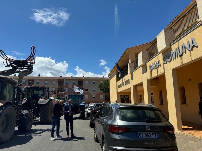 Les agriculteurs manifestent devant la mairie de Ghisunaccia où devait se tenir le lancement du projet de territoire sur l'eau.(Document CNI)
