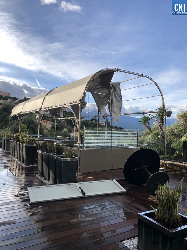 L'Hôtel "Chez Charles" à Lumio a vu toute les devantures de sa terrasse arrachées et mobilier emporté par les bourrasques de vent.
