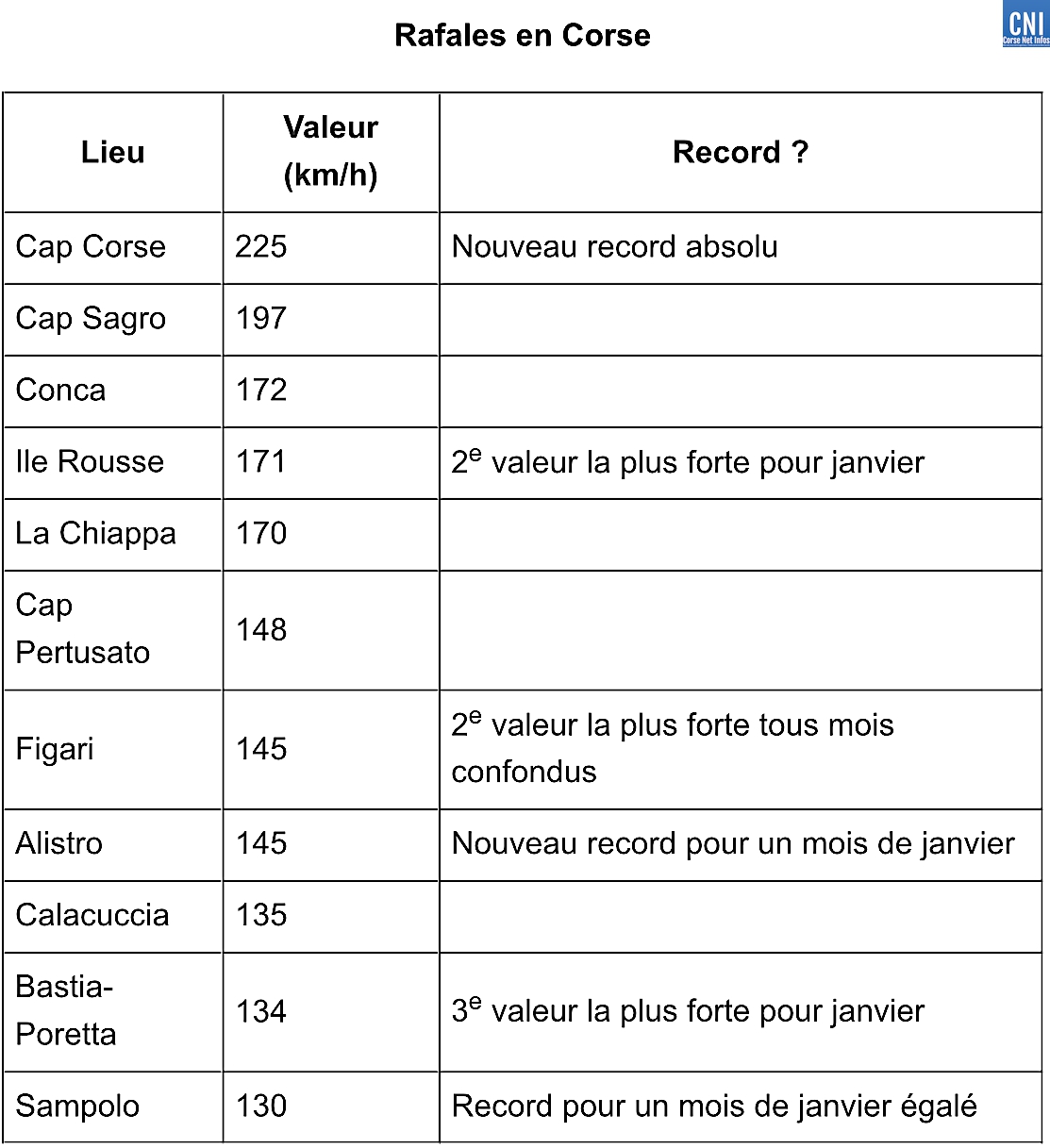 Sur les routes les cols de Verde et de Sorba ont été fermés à al circulation en raison de la violence des vents qui ont atteint 113 km/h à Figari, 141 km/h dans le secteur de Bonifacio et 170 km/h à La Chiappa, à Porto-Vecchio.