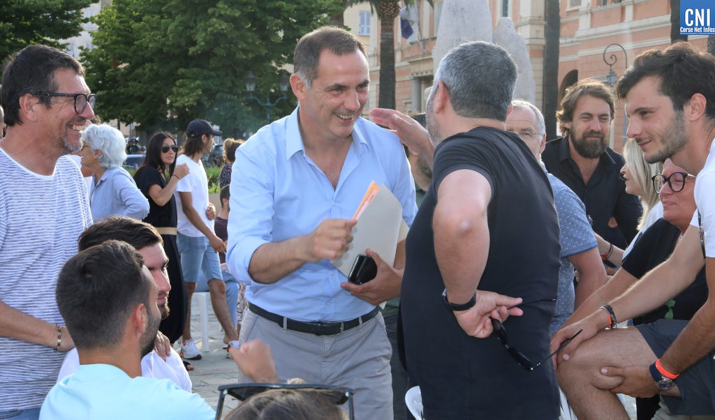 Légèrement en retard par rapport à l’horaire prévue, Gilles Simeoni a été très acclamé lors de son arrivée. En attendant, le staff organisateur avait minutieusement tout préparé : chaises nettoyées, programmes distribués, tribunes entourées de six arbres, le tout au son de chants corses le plus souvent d’hier, notamment « A Palatina », slogan musical de cette campagne.