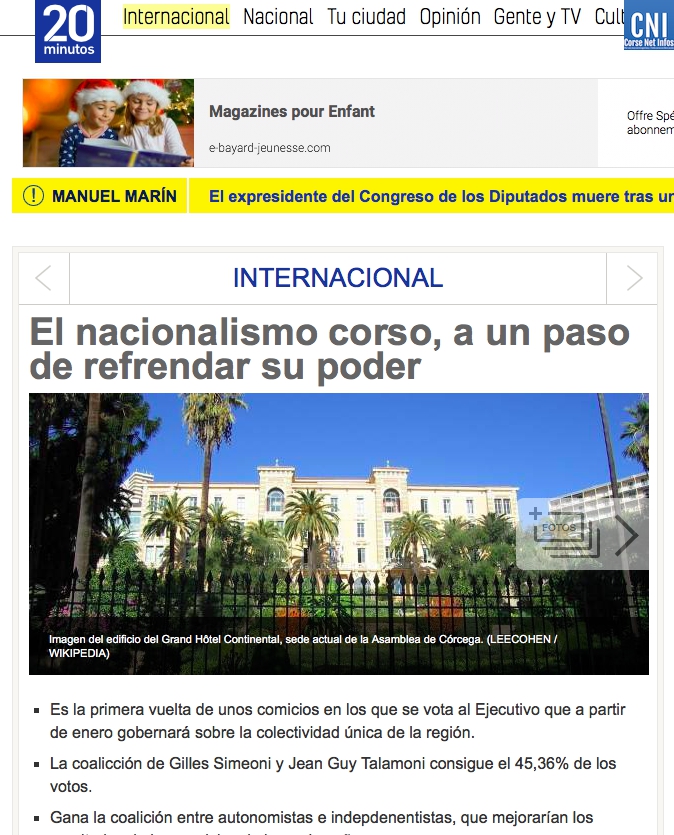 La presse internationale avait les yeux rivés sur la Corse, ce dimanche 3 décembre, pour le premier tour des élections territoriales. De nombreux journalistes, notamment des médias catalans et basques, ont été envoyés sur place pour observer de près l’ascension des nationalistes et, en raison de la vague indépendantiste qui traverse l'Europe ces derniers temps, la victoire (au premier tour) des Nationalistes a fait couler beaucoup d’encre dans les pages des journaux étrangers.