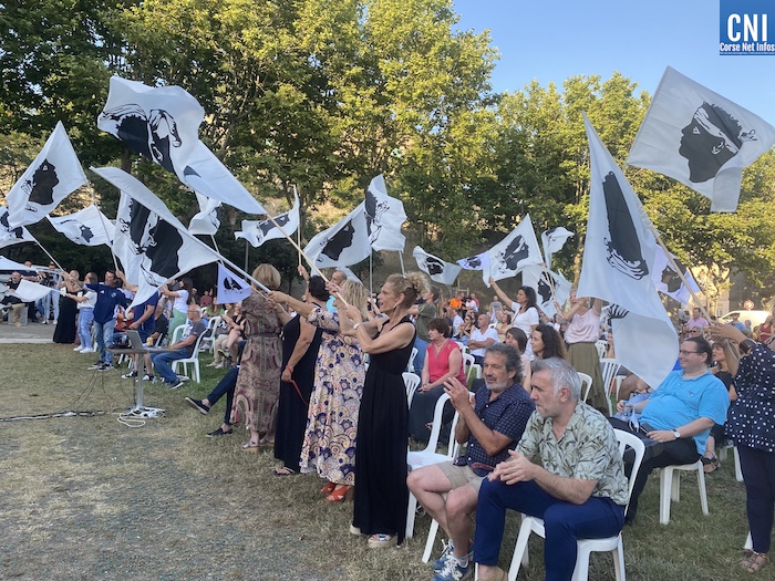 Pour accueillir le premier intervenant, l'agriculteur Antoine Carli, 59ème sur la liste, les bandere sont de sortie. "Depuis notre première campagne nous avons senti que quelque chose se passait. Un vent nouveau s'est levé, nous l'avons senti ce dimanche", lance-t-il à la foule. Parmi les spectateurs, Mateo Agostini et Anghjulu-Maria Pietri, deux amis de 19 ans assistent avec interêt à cette rencontre publique. "Je crois que dimanche quelque chose est possible. Aujourd'hui je viens soutenir un mouvement avancé qui incarne le changement. Pour moi c'était important d'être présent à leurs côtés dans les urnes, mentalement mais aussi physiquement", explique le jeune militant.