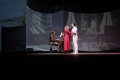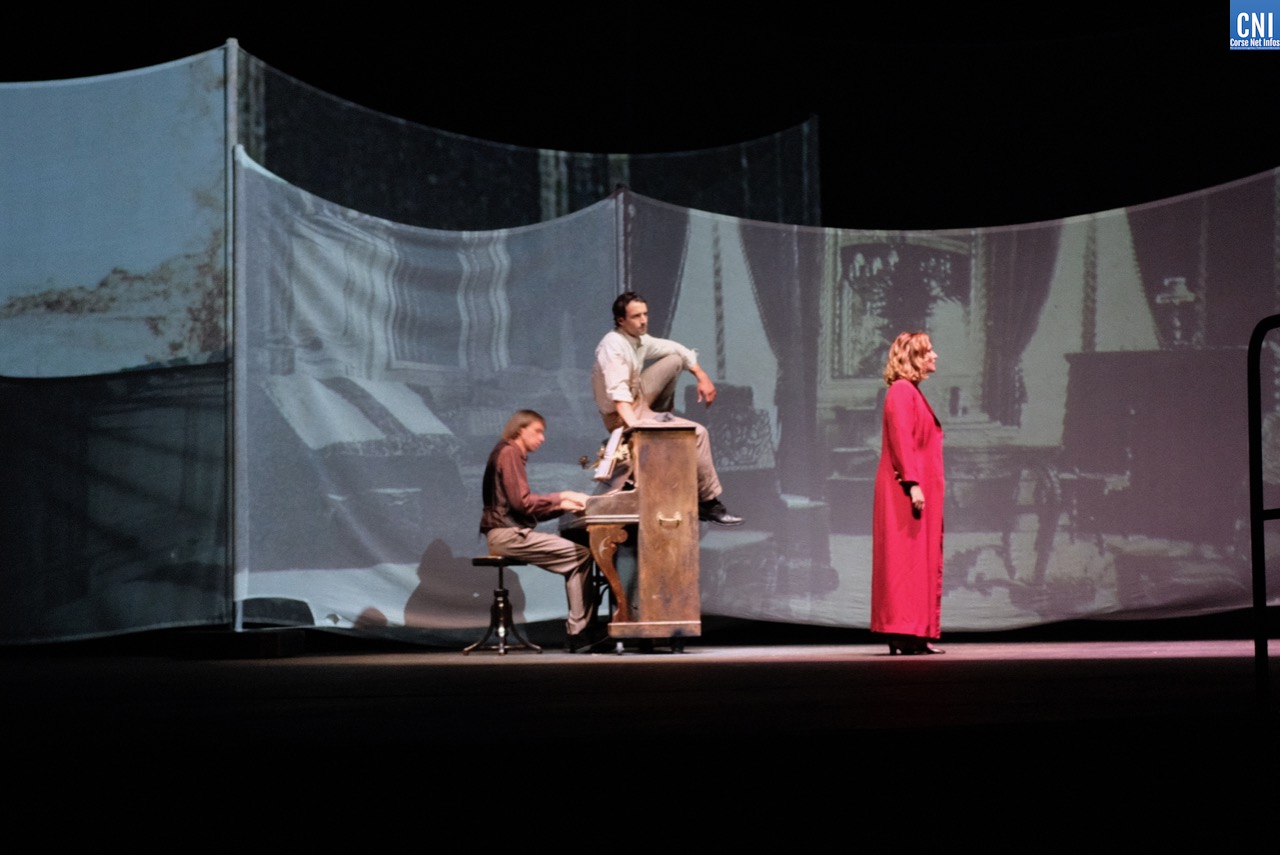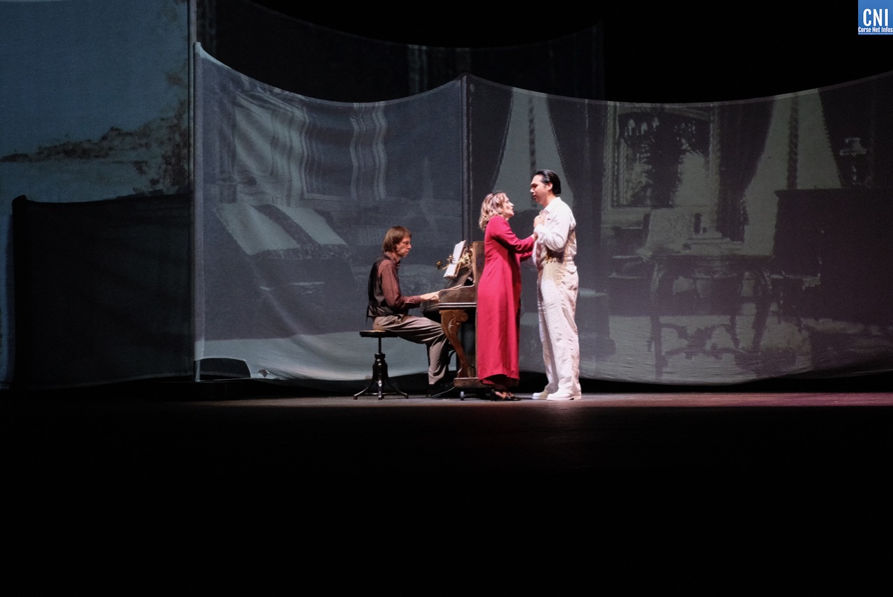 Sur scène, ils sont deux pour interpréter Vezzani, l’acteur Gray Orsatelli (portrait ici) et le ténor ajaccien Jean-François Marras. Alternant leur présence en fonction des parties chantées, ils se retrouvent aussi tous les deux sur scène comme lors de la rencontre avec Agnès Borgo qui deviendra la femme de César Vezzani. Cette dernière est interprétée par Julia Knecht, impressionnante dans la partie lyrique mais également lorsque elle donne la réplique.