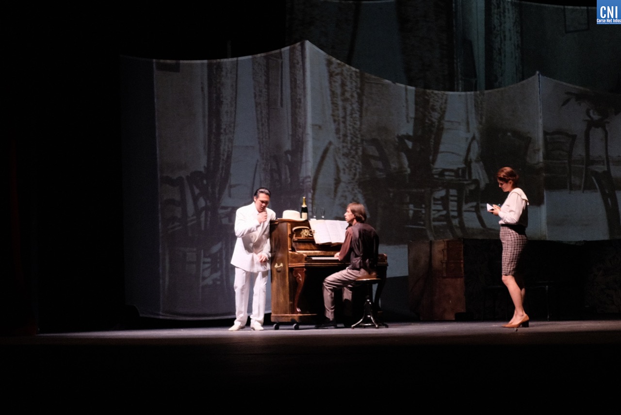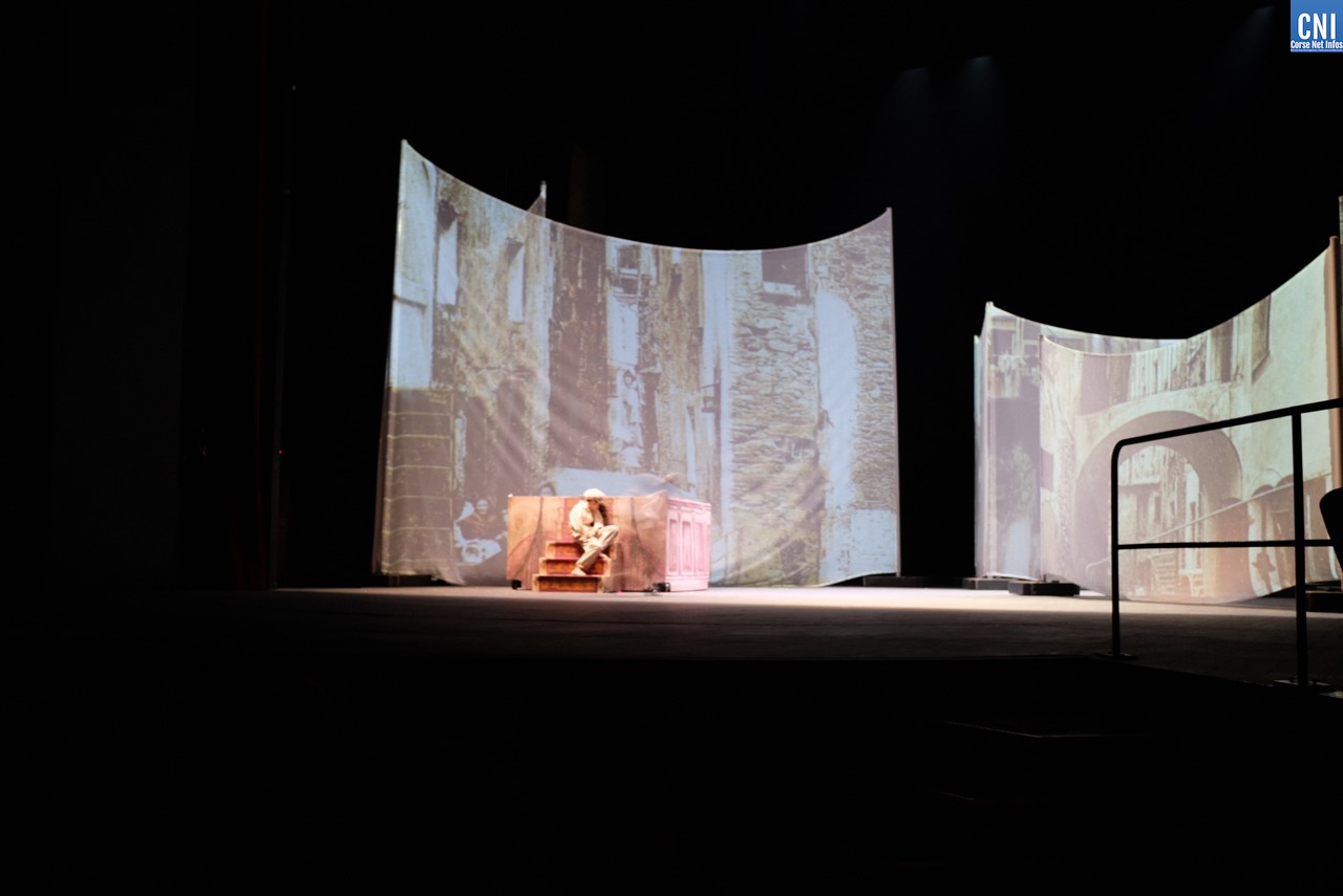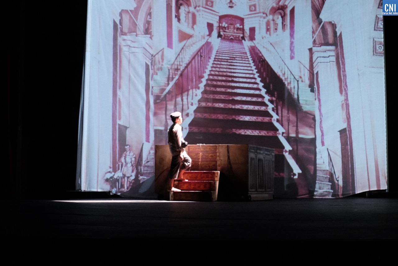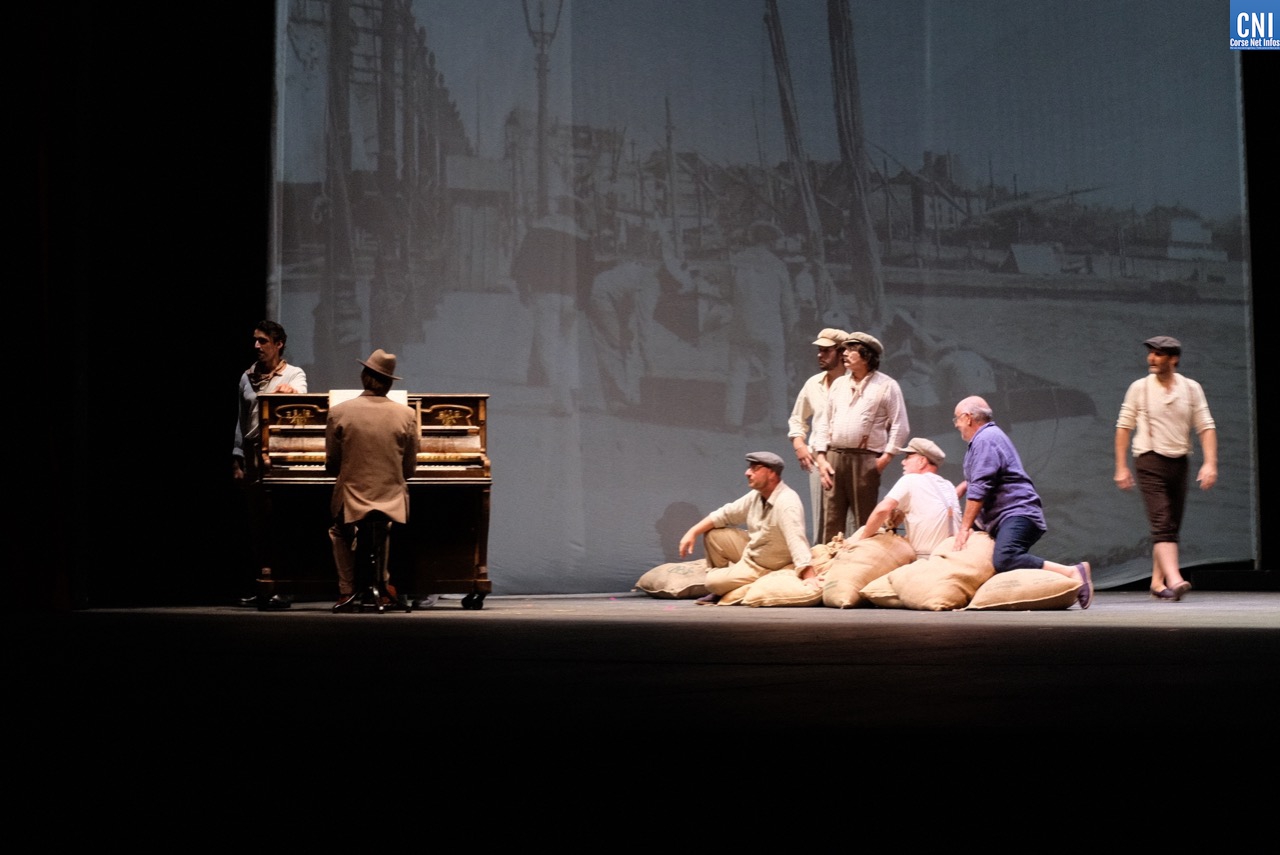 C’est donc un public venu en nombre, au regard des conditions sanitaires, qui mesure la chance d’être là pour découvrir cette création pour laquelle Jean-Pierre Lanfranchi et toute sa troupe n’ont pas lésiné sur les moyens. Dès les premières minutes, une scénographie audacieuse et le choix de la langue corse nous replongent dans le Bastia du début du XXe siècle. Le dispositif scénique est impressionnant avec des images d’archives projetées sur d’immense toiles de décors. L’enfance de Vezzani, sa mère, son adolescence et jusqu’à son travail de docker sur le port de Toulon, le spectateur suit ce chemin qui l’a conduit à devenir un ténor célèbre.
