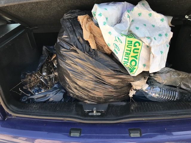 C’est que, moi la première, je n’imaginais pas en trouver autant, de déchets. Jusqu’ici, je voyais bien, au passage, flotter quelques trucs en plastique ou en ferraille dans le foin des fossés. En y regardant de plus près, il n’y a pas un coin qui ne soit souillé. C’est une pollution insidieuse qui transforme le paysage en une gigantesque poubelle à ciel ouvert : on a mangé, bu, beaucoup beaucoup fumé et on a balancé tous les emballages, les canettes, les bouteilles, on a tout balancé jusqu’au briquet. Les mégots sont absolument partout et les paquets de cigarettes par centaines.