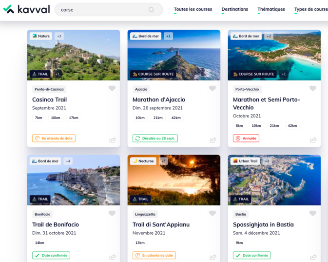 Que ce soit par des courses mythiques comme le Restonica Trail, le Marathon et Semi de Porto-Vecchioou encore le Trail de Bonifacio, ou bien par des événements plus intimistes comme le City Trail Di Sartè ou le Trail de Monaccia , le moteur de recherche de running KAVVAL propose de découvrir la Corse d’une nouvelle manière par l’intermédiaire du sport.