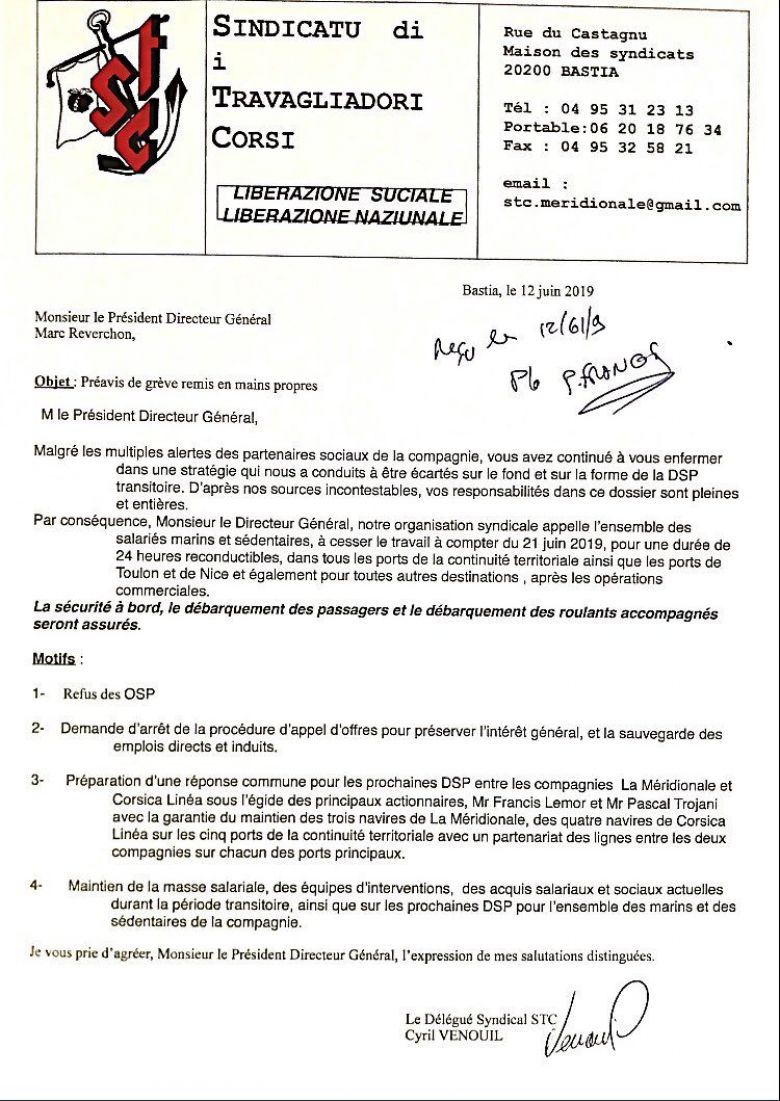 Les syndicats CGT, STC et CFTC de la Méridionale ont déposé un préavis de grève illimitée à compter du 21 juin dans tous les ports de la continuité territoriale corse, les ports de Toulon et Nice et toutes les destinations où la compagnie officie. Ils demandent, d’une même voix, l’arrêt de la procédure d’appel d’offres sur la Délégation de service publique (DSP) maritime qui exclut leur compagnie des principales lignes corses.