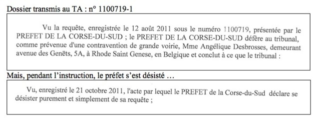 "Le dossier porte le numéro 1100719-1. L’affaire suit son cours… Jusqu’au 21 octobre 2011, date à laquelle le préfet se désiste purement et simplement de sa requête (télécharger le jugement )