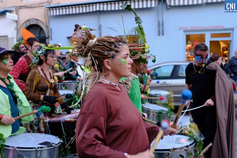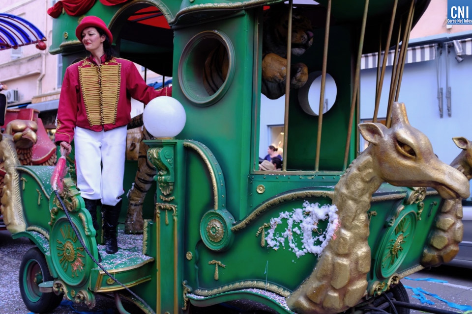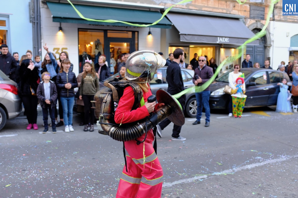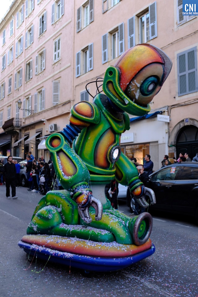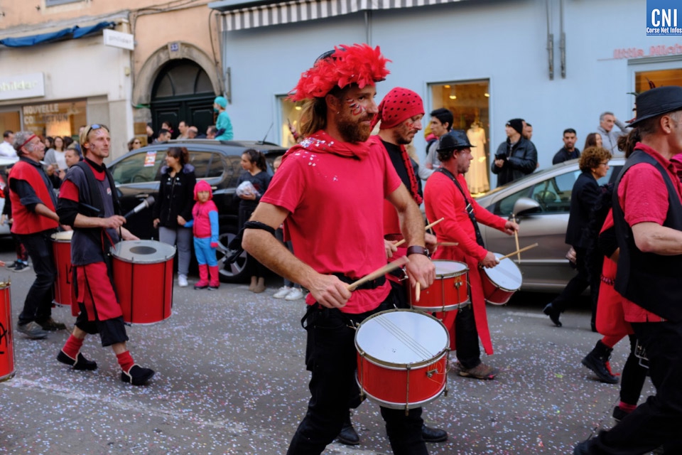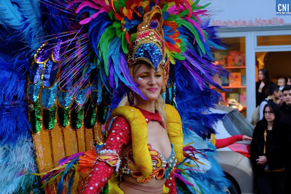 Grand soleil sur Bastia et une température plutôt clémente. C’est une voiture de police, sécurité oblige, qui ouvre le cortège mais ils sont suivis de près d’un groupe de danseuses brésiliennes qui nous font vite oublier la présence des forces de l’ordre. Maquillées, costumées, le sourire au lèvre, elles enchantent les passants de leurs pas de danse cadencé au rythme des tambours et autres instruments de métal de la batucada qui les suit. Vêtus de rouge et noir, eux aussi font le show et sont largement applaudis par la foule, nombreuse, massée de chaque côté du boulevard Paoli. Les premiers chars arrivent dont celui des pompiers qui s’amusent à arroser la foule de banderoles de couleur. Entre deux chars superbement customisés, approche une deuxième batucada au rythme un peu plus approximatif que la première mais à la bonne humeur communicative. Ils sont habillés de vert et de marron, quelques végétaux accrochés à leur veste ou leur chapeau, probablement censé évoqué la nature et l’écologie.