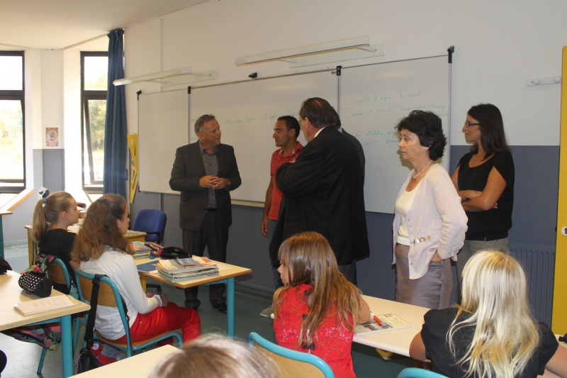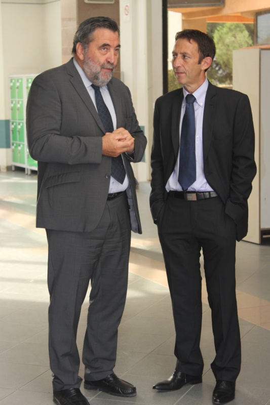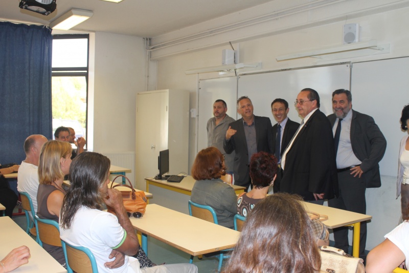Il est 10H30 lorsque Michel Barat, Guy Monchaux et Christiane Revest accompagnés d’Alexandre Sarrola, maire de la commune de Sarrola Carcopino, franchissent les grilles du collège accueillis par Pierre Albertini, principal du collège et Sophie Carbuccia, adjointe. Cela fait déjà deux heures que les élèves de 6ème ont fait leurs premiers pas dans leur nouvel établissement scolaire. La particularité du collège de Baléone réside dans le fait que les classes de 6ème font leur rentrée, accompagnés de leurs parents, avec le collège pour eux seuls, la rentrée des 5ème, 4ème et 3ème étant différée de 24 heures. Les nouveaux collégiens sont appelés par classe puis accueillis par leur professeur principal qui les guidera tout au long de cette première journée. On leur présente leurs différents professeurs, leur emploi du temps, les ouvrages scolaires sont attribués. Pendant ce temps, les parents présents sont accueillis par le principal, son adjointe, et la gestionnaire qui leur expliquent le fonctionnement et les règles de l’établissement. Les parents sont ensuite répartis dans différentes classes afin de rencontrer les enseignants de leurs enfants. C’est là que Michel Barat, Guy Monchaux et Chistiane Revest viendront à la rencontre des parents, élèves et professeurs guidés par Pierre Albertini et Sophie Carbuccia.
