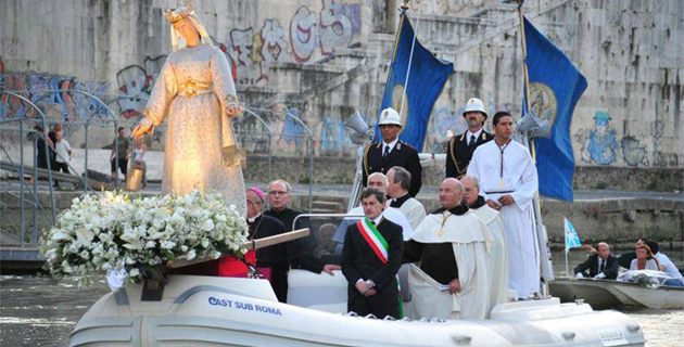 Les Romains se souviennent que cette cérémonie commémore la découverte en 1543 par des pêcheurs corses, au large d’Ostie, d’une caisse contenant la statue d’une magnifique Vierge. Les pêcheurs la ramenèrent par le Tibre jusqu’à Santa Agata, église attenante à San Crisogono et siège de l’Archiconfraternita del Santissimi Sacramento e Maria Santissima del Carmine in Trastevere, à qui elle fut confiée.