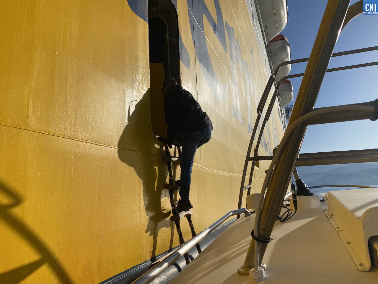 Les patrons de pilotine conduisent le pilote vers le ferry, toujours en marche, vers le port pour qu'il puisse monter à bord grâce à une petite échelle en corde déployée par l'équipage du ferry.