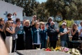 Quelques minutes auparavant l'épouse de Guy Bedos, ses enfants sont précédés par le cercueil. Arrivés devant le tombeau, réalisé à la hâte, Patrizia Poli, Patricia Gattaceca et Lidia Poli entonnent le Dio Vi Salvi Regina. Les enfants de Guy prennent ensuite la parole pour rendre hommage au papa adoré. La dérision, l'humour caustique, comme le père aimait sont employés. Le public ne peut s'empêcher de rire, d'applaudir.