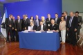 Le ministre Manuel Valls, le Président de l'exécutif Paul Giacobbi, le Préfet de Corse Patrick Strzoda et l'assemblée, lors de la signature de la 3è tranche du PEI, mardi matin à la Collectivité Territoriale de Corse. (Photo : Marilyne Santi)