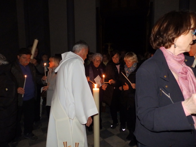 Toutes ces petites lumières représentaient le message de Pâques, le passage des ténèbres à la lumière. Après la dernière lecture, l’évangile de St-Luc, les lampes se sont progressivement éclairées et le prêtre a béni l’eau du baptême en aspergeant l’assistance. Tous ont énoncé leur profession de foi et la messe a commencé. A la fin de la célébration le père Monkin a souhaité une bonne fête à tous les participants en les remerciant de leur présence.