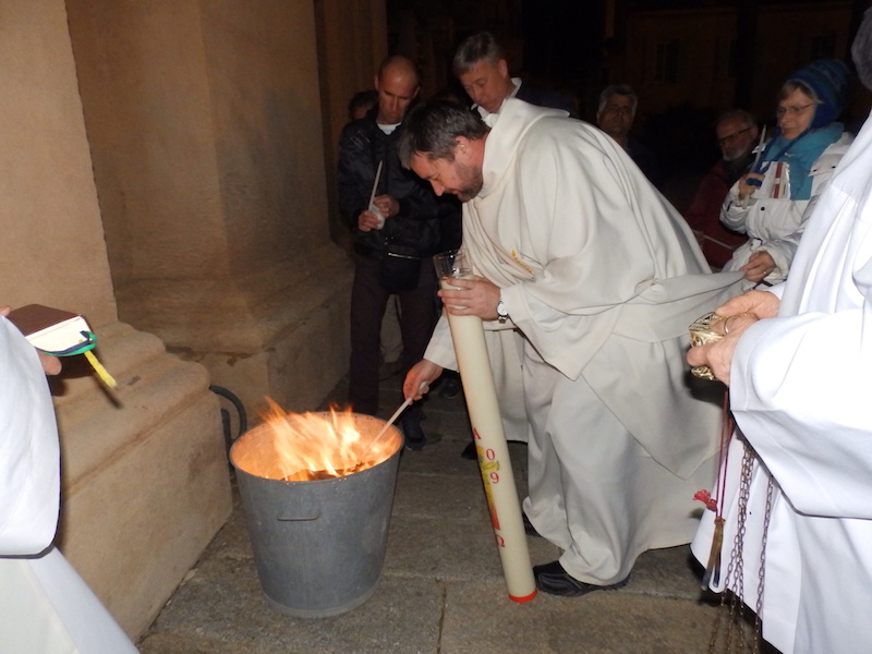 Le feu symbolise la lumière du Ressuscité, malheureusement pas de grand brasier pour la bénédiction à l’Île-Rousse cette année à cause du vent très violent. Par contre, le père Marcin Monka et le diacre Thierry Del Piero ont tout de même réussi à allumer un feu plus modeste à l’abri des rafales, pour accéder dans l’église de l’Immaculée Conception avec le cierge pascal allumé. Les célébrants sont entrés dans l’édifice sombre, suivis en procession par les fidèles qui allumaient tour à tour leurs propres cierges au cierge pascal.