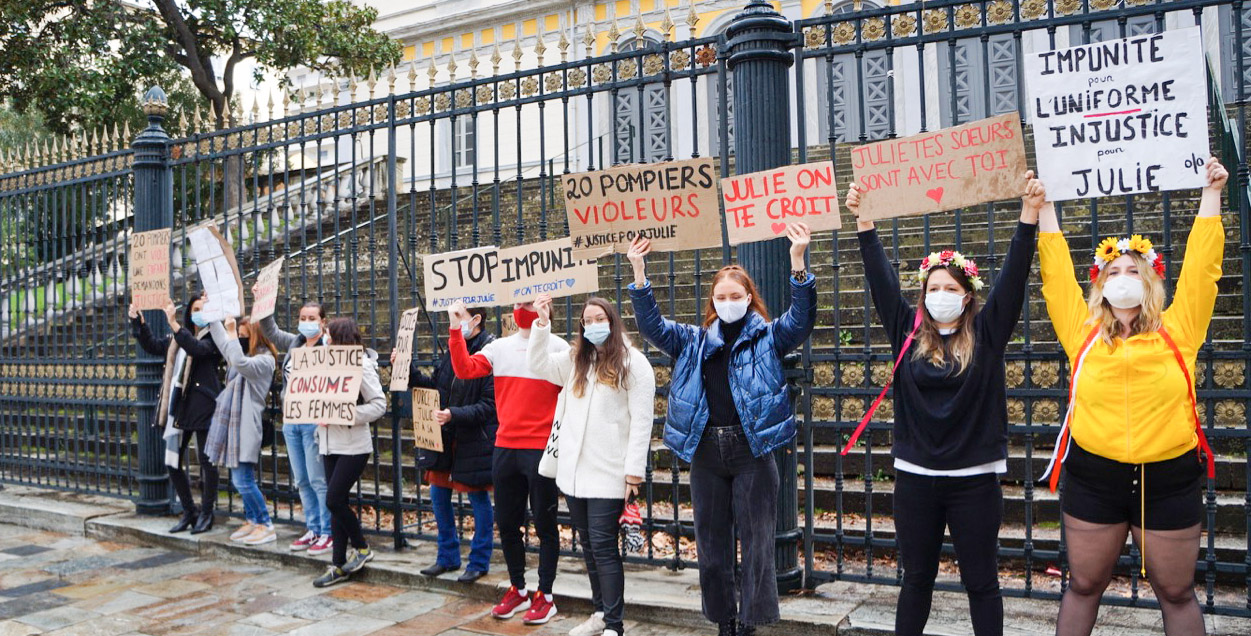 Autour d’elle, les jeunes femmes laissent éclater leur colère : « 20 pompiers, des militaires ! Quelle honte. Julie avait 13 ans, c’était une enfant. On ne peut plus accepter ce sentiment d’impunité. » Révoltées, elles comptent dénoncer ce qu’elles qualifient de « déni de justice. » Elles lèvent pour ça bien haut des pancartes explicites : « 20 pompiers ont violé une enfant. Demandons justice », « Une enfant n’est jamais consentante », « Justice pour Julie » ou encore « Au feu au viol ».