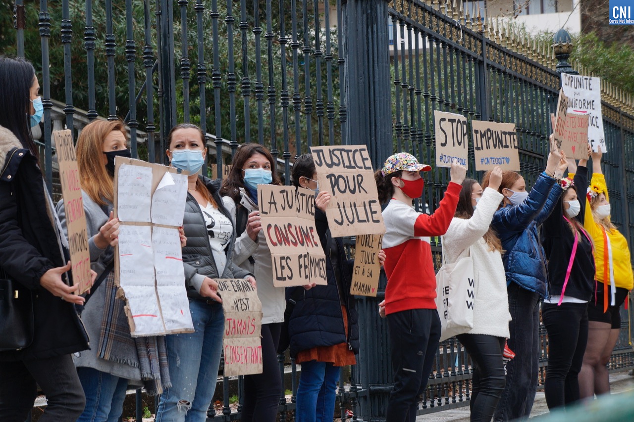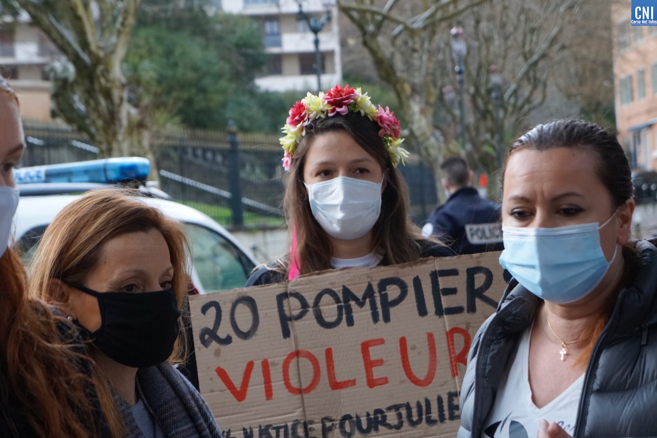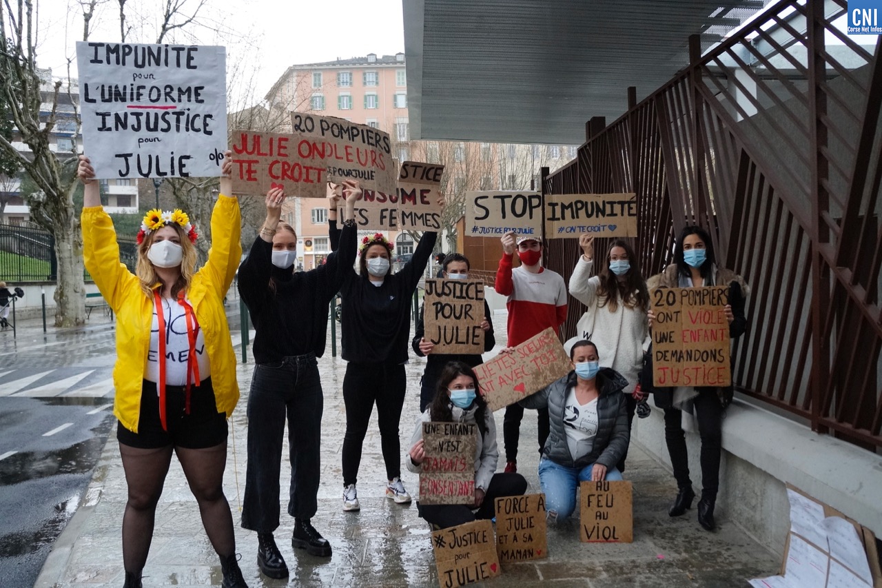 Ce ne sont pas les quelques gouttes de pluies ni le passage de la police municipale qui les arrêteront dans leur combat. « A l’appel de la maman de Julie et de diverses associations, nous avons tenu à manifester et apporter notre soutien, - explique Aude. - Nous nous sentons solidaires de son combat. » “Nous” ce sont une dizaine de femmes et d’hommes – issus de mouvements tels que Femmes Solidaires corses, Donne E Surelle, Collages Féminicides ou encore des représentantes des Femen sur l’île – venus spontanément apporter leur soutien à Julie [le prénom a été changé, NDLR]. Cette jeune fille a été violée et agressée sexuellement par 20 pompiers professionnels de Paris. L’affaire remonte à dix ans, elle avait alors entre 13 et 15 ans au moment des « faits ». Suite à une plainte déposée fin août 2010, aucun pompier ne sera auditionné par la police. Finalement, trois d'entre eux finiront par être mis en examen en février 2011 pour viol en réunion sur mineur vulnérable de moins de quinze ans. Pour les 17 autres, 15 ont eu des « relations sexuelles » avec pénétration mais ne seront pas poursuivis sous prétexte qu’ils ignoraient l'âge de la victime. Une information qui va à l‘encontre des fiches d'intervention que remplissent ces pompiers et dans lesquelles l'âge est précisé.