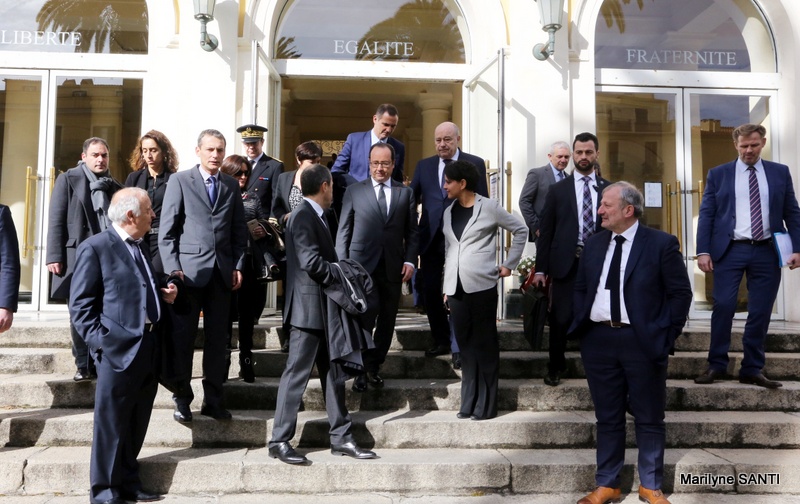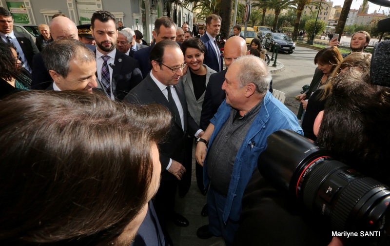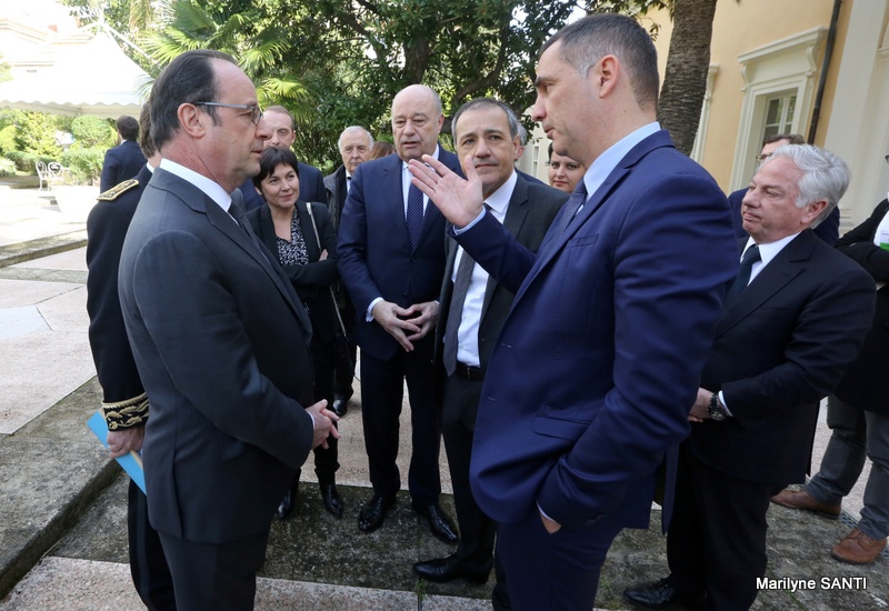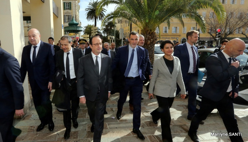 Il est 9 heures et demi quand la Préfecture de Corse ouvre ses portes à l’arrivée du chef de l’Etat. Entouré des ministres Jean-Michel Bayle (aménagement et territoire), Najat Vallau-Belkacem (Education Nationale) et Annick Girardin (Fonction Publique), François Hollande a déposé une gerbe et s’est recueilli devant la plaque à la mémoire de Claude Erignac. Le Président de la République a, ensuite, rejoint Pierre-Jean Luciani, président du Conseil Départemental de la Corse-du- Sud, Jean-Guy Talamoni, président de l’Assemblée de Corse et Gilles Simeoni, président de l’Exécutif, dans les jardins de la Préfecture, pour un entretien de trente minutes.