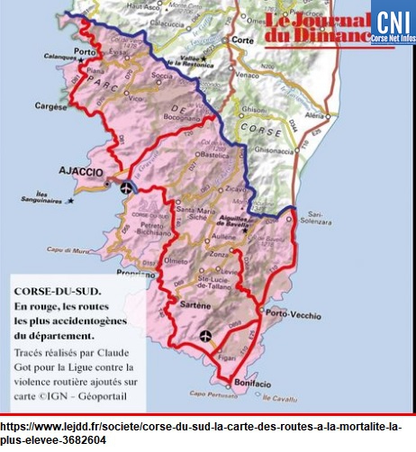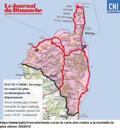Routes concernées par une forte accidentalité dans les départements de Corse entre 2006 et 2015.