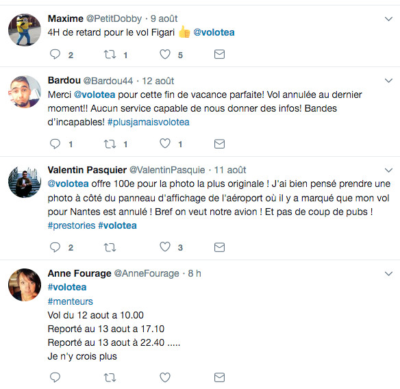 Volotea s'est excusée auprès de ses passagers et a promis des indemnisations financières : « Dans tous les cas, Volotea a essayé d'informer les passagers concernés à l'avance et tous seront rapidement indemnisés conformément à la réglementation applicable et se verront proposer de les conduire à destination dans les meilleurs délais. Volotea s'excusera personnellement auprès de tous les passagers concernés et les indemnisera pour les retards et les inconvénients. Volotea fait de son mieux pour régler la situation ce dimanche. Nous sommes navrés pour les inconvénients causés ces derniers jours à cause de problèmes techniques inattendus qui sont malheureusement arrivés au même moment ». La compagnie s’efforce de réparer les dégâts sur la clientèle en répondant directement aux Tweets incendiaires : « Nous sommes tellement désolés de cette situation. Nos équipes mettent actuellement tout en œuvre pour vous faire décoller dès que possible. À votre arrivée, contactez notre service de réclamations par ici https://bit.ly/2nn8imT . Cordialement ».