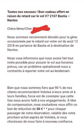 L’indemnisation en question est un bon de 50 € sur un prochain vol Volotea. Les réactions des Internautes fusent, certains conseillant aux passagers de refuser le bon, arguant le droit européen. Il est vrai que, dans ces circonstances, Bruxelles impose aux compagnies aériennes de ne pas se contenter d'un simple remboursement de billets. Si les passagers n’ont pas été prévenus au moins quinze jours à l’avance de l’annulation de leur vol et si la responsabilité de la compagnie est en cause, une indemnité compensatrice est due. Suite à la décision de la compagnie low-cost Ryanair, qui, touchée par une grève européenne de ses pilotes, avait refusé d’indemniser ses passagers lésés, la Cour de justice européenne, dans un arrêt publié en avril dernier, établit que les compagnies aériennes doivent « indemniser leurs passagers si ces derniers ont été affectés par des retards de vols ou des annulations dus à des grèves de leur personnel ». L’indemnisation est de 250 € pour les vols de moins de 1500 km, 400 € pour les vols entre 1500 et 3000 km, et 600 € pour les vols de plus de 3000 km.
