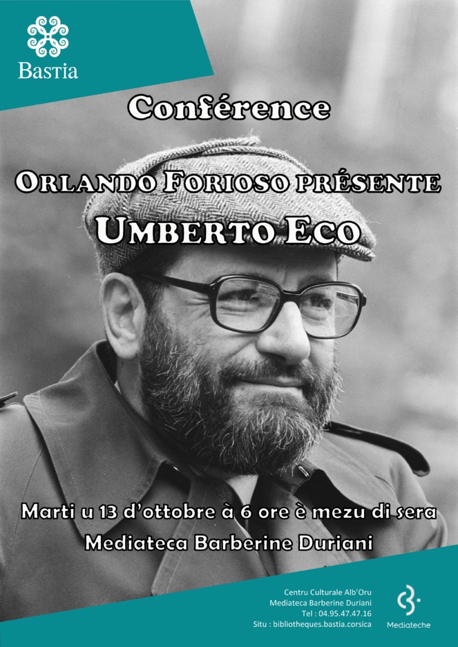 Mardi 13 octobre à 18h30 à la Médiathèque Alb’Oru - Barberine Duriani - Bibliothèques de Bastia Orlando Forioso présente Umberto Eco