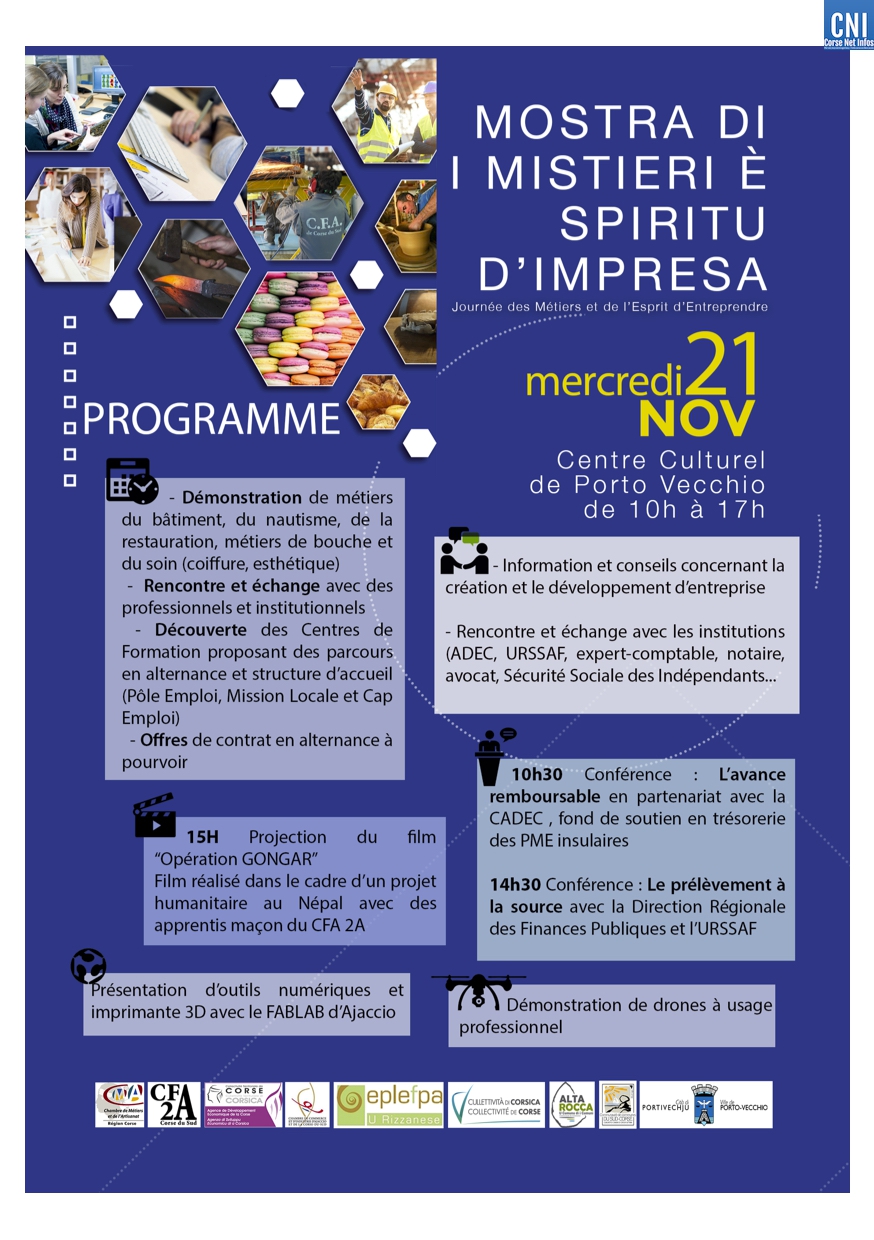 La Chambre de Métiers et de l’Artisanat de la Corse organise les Journées des Métiers et de l’Esprit d’Entreprendre, « MOSTRA DI I MISTIERI E SPIRITU D’IMPRESA ». Elles ont pour ambition d’être au cœur